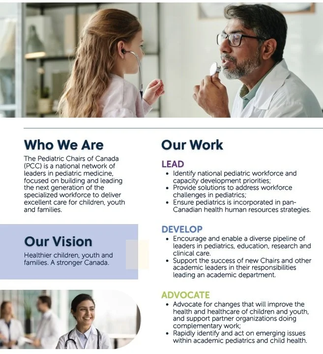 The Pediatric Chairs of Canada is a national network of academic leaders in pediatric medicine. We are dedicated to strengthening the future of pediatrics by working together to advance education and research in support of excellent care for children youth and families. In alignment with our core mission, we focus our public communications on issues that directly pertain to these matters, and where our collective voice delivers expertise and impact. We appreciate public interest in our work and will continue to provide informed, evidence-based perspectives on issues that relate to our specialization and focus as an organization, and as academic leaders.
